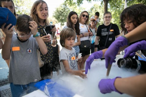 Más adelante, varias carpas bullían de actividad cuando los más jóvenes y sus familias tuvieron la oportunidad de participar en talleres dirigidos por estudiantes de doctorado. Allí aprendieron sobre los secretos del ADN. Como en años anteriores, la carpa más popular fue aquella en la que los niños vieron cómo se elaboraban helados con nitrógeno líquido. No es de extrañar que esta carpa estuviera rodeada de público durante toda la mañana en busca de un poco de alivio bajo un sol abrasador.