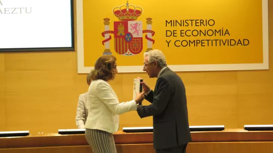 Joan Guinovart, director del Instituto de Investigación Biomédica (IRB Barcelona), ha recogido esta mañana en Madrid la acreditación del programa de excelencia Severo Ochoa, que reconoce al IRB Barcelona como uno de los mejores centros de investigación básica del estado por segunda vez. El acto, presidido por la secretaria de Estado en I+D+i, Carmen Vela, ha celebrado en la sede del Ministerio de Economía y Competitividad y han asistido representantes de los 11 centros reconocidos en esta edición.