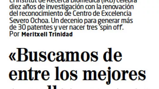 Extenso reportaje en El Mundo sobre los 10 años del IRB Barcelona con una entrevista al director del centro, Joan J. Guinovart. Despieces sobre la investigación de Ángel R. Nebreda y Lluís Ribas de Pouplana