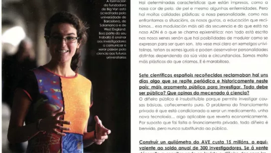 La publicación gallega ECO Revista do eixo atlántico, en su versión en papel, ha entrevistado a la bióloga Helena González-Burón, quien obtuvo el doctorado en biomedicina en el IRB Barcelona. Además, ocupó el cargo de Public Engagement & Science Educaction officer del centro desde junio del 2014 hasta marzo del 2016. En la actualidad, es miembro del grupo de divulgación científica Big Van.