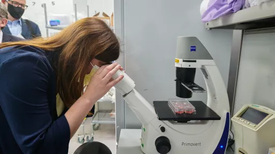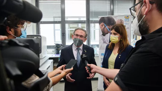 El viernes 11 de junio, en el marco de la semana de Puertas Abiertas, el IRB Barcelona recibió la visita de la consejera de Investigación y Universidades, el honorable Gemma Geis y el consejero de Economía y Hacienda el honorable Jaume Giró . Los recibieron el director del IRB Barcelona Dr. Francesc Posas, el subdirector Dr. Raúl Méndez y la directora de gestión Dra. Margarita Corominas. Después de compartir necesidades y proyectos de futuro en una reunión, los consejeros visitaron la plataforma de Cribado de Fármacos y el laboratorio de Cáncer Colorrectal del Instituto. Al finalizar la visita atendieron brevemente los medios.