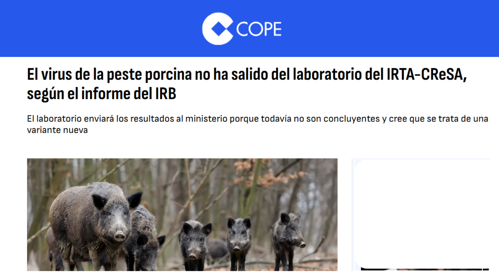 COPE - El virus de la peste porcina no ha salido del laboratorio del IRTA-CReSA, según el informe del IRB