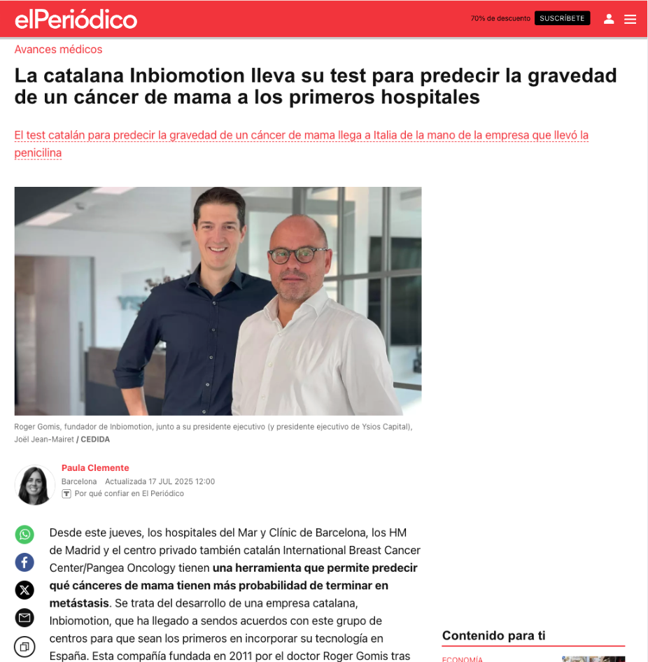 El Periódico - La catalana Inbiomotion lleva su test para predecir la gravedad de un cáncer de mama a los primeros hospitales