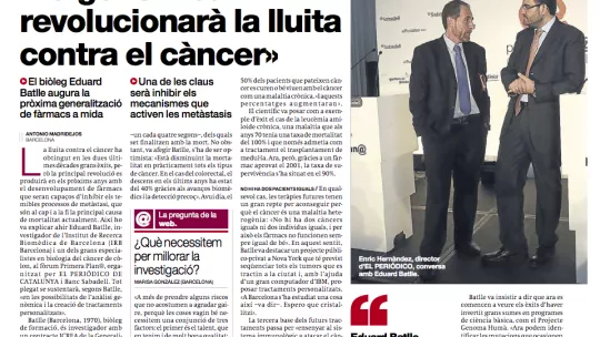 Crónica del coloquio Primera Plana organizado por El Periódico donde Eduard Batlle, jefe del laboratorio de cáncer colorrectal, expuso el estado actual de la investigación en cáncer. Batlle se muestra confiado de que en los próximos años los avances en el campo aumentarán notablemente la supervivencia de los pacientes con cáncer, tal y como ya se ha hecho patente en los últimos años.