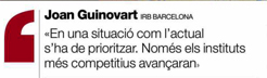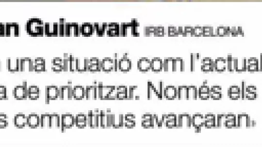 El director del IRB Barcelona, Joan J. Guinovart, opina que “en una situación como la actual se debe priorizar. Sólo los institutos más competitivos avanzarán.” El reportaje también incluye declaraciones de Lluís Torner (ICFO), Miquel Àngel Pericàs (ICIQ) y Salvador Solà-Moya (Institut de Paleontologia Crusafont), entre otros.