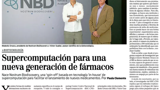Varios medios han recogido el lanzamiento de la nueva empresa de biotecnología Nostrum BioDiscovery, un proyecto común del IRB Barcelona y el Barcelona Supercomputing Center-Centro Nacional de Supercomputación (BSC-CNS). Modesto Orozco, líder del grupo Molecular Modelling and Bioinformatics en el IRB Barcelona, será el presidente de la nueva empresa spin-off, que tiene el objetivo de facilitar el lanzamiento al mercado de nuevos fármacos y moléculas biotecnológicas mediante simulación computacional.