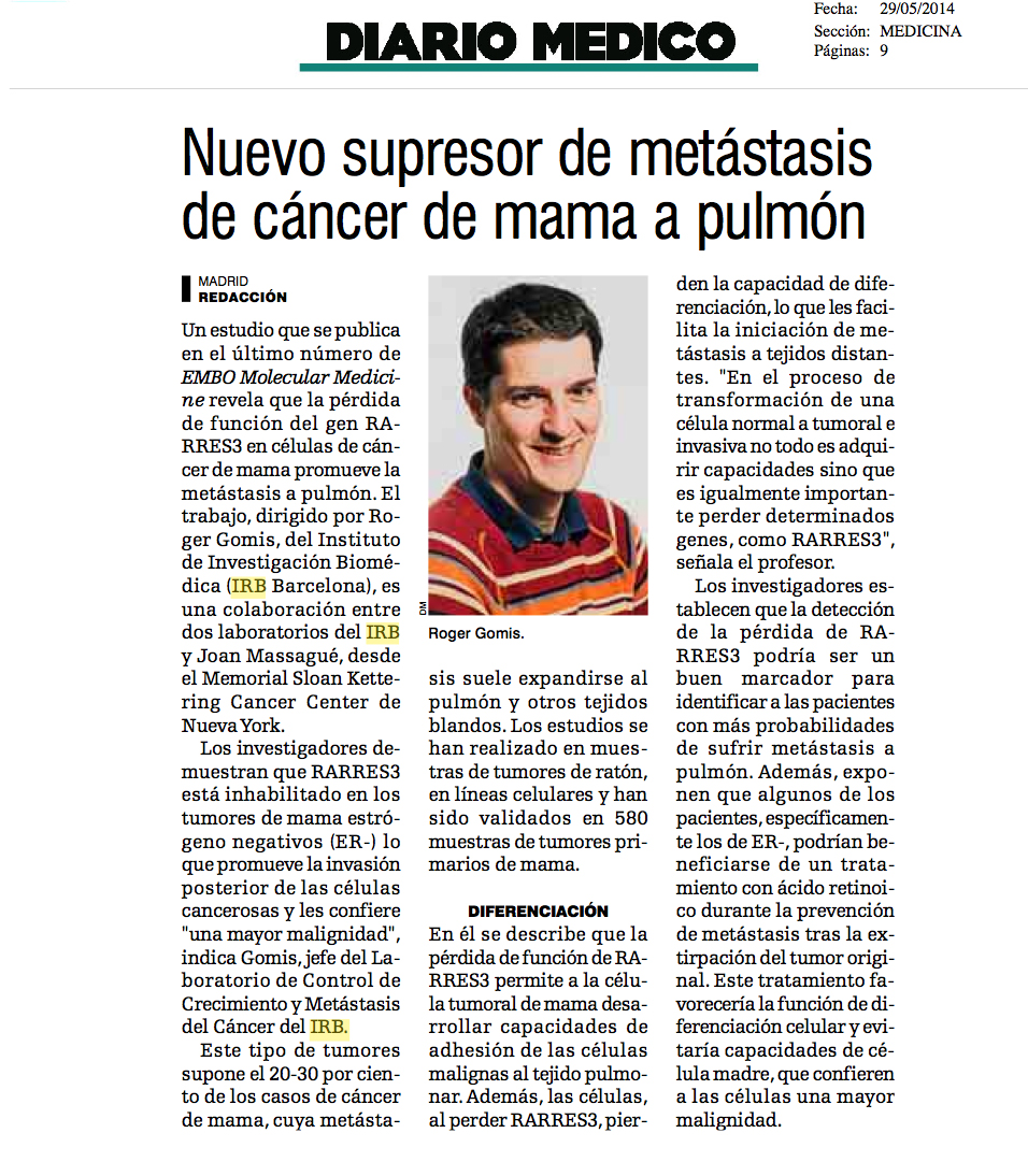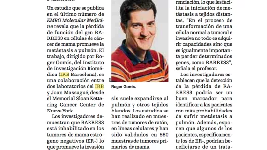 La prensa se hace eco del artículo publicado por Roger Gomis EN EMBO Molecular Medicine sobre RARRES3, un gen que suprime las metastasis de mama a pulmón.