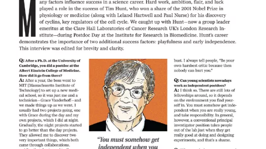 Entrevista al premio Nobel Tim Hunt publicada en Science que la corresponsal de Science Careers en Barcelona, Elisabeth Pain, le hizo durante el primer IRB Barcelona PostDoc Day. Hunt ofreció la sesión plenaria de las jornadas de los investigadores postdoctorales. Hunt, que ganó el premio Nobel en 2001 por el descubrimiento de las ciclinas expone cuales son los puntos claves que le hicieron triunfar en el mundo científico.