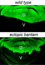El estudio realizado por el Laboratorio de Desarrollo y Control del Crecimiento del IRB Barcelona ha conseguido reconciliar estas dos hipótesis al encontrar el eslabón perdido entre la vía de señalización de Notch y la formación del borde DV. Mediante la represión del microRNA bentam en las dos poblaciones celulares situadas a ambos lados del borde del ala, Notch permite que el regulador de actina Enabled se exprese con normalidad. En estas células, Enabled induce la elongación del citoesqueleto a lo largo de la parte de la membrana celular que delimita el compartimento, creando una tensión que contribuye la formación del borde DV. bentam se convierte así en el nuevo actor molecular que regula la compartimentalización del ala de Drosophila.