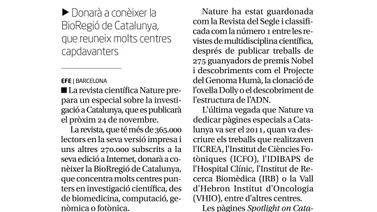 Regió7 recoge la noticia del especial que está preparando la revista Nature sobre la investigación en Cataluña, que se publicará el próximo 24 de noviembre. El especial incluirá contenido editorial específico de la región, conjuntamente con artículos promocionales y anuncios de las universidades, instituciones científicas y empresas privadas. El IRB Barcelona apareció en el último especial de la revista sobre Cataluña en 2011.