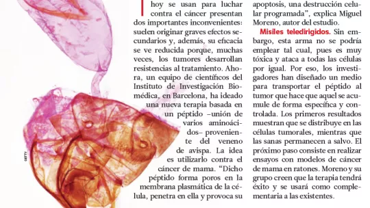 El laboratorio de Péptidos y Proteínas, liderado por Ernest Giralt, publicó en la revista Journal of Controlled Released una propuesta de terapia para el cáncer de mama usando el veneno de avispa. El magazine Muy Interesante de agosto se ha hecho eco del estudio.